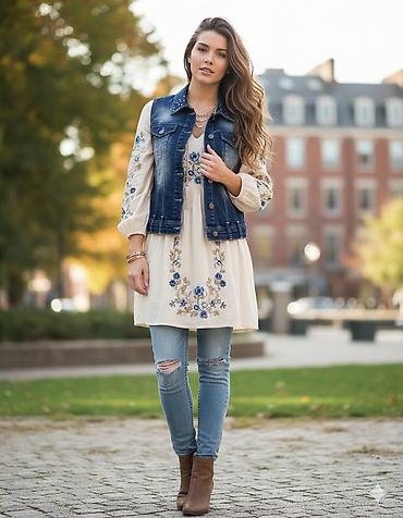 Qadınlar üçün uzun denim jilet - Material: yüngül mavi cins (denim) - Model: qolçu, yaxalıqlı, düyməli ön bağlanma - Uzunluq: buddan aşağı (tunik/uzun jilet stili) - Dizayn: distressed (cəhrayılan...