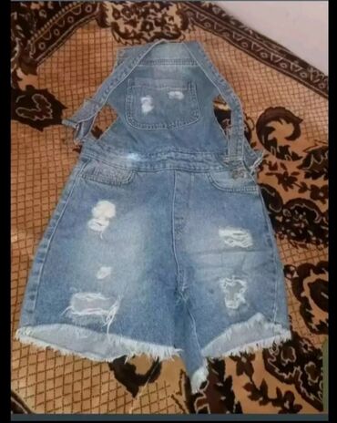 - Cins kombin‑şort: Açıq mavi, yırtıq və aşınmış effektli denim. Ön cib və arxa sinədə böyük cib, tənzimlənən çiyin qayışları. Kənarları “xam” kəsimli, rahat və sport‑casual görünüş.