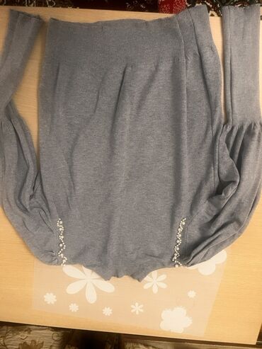 - Boz trikotaj sviter: yarım-balıqçı yaxa, rezinli ətək və qollar, sağ qolun aşağı hissəsində çəkic düymələr. Yumşaq, nazik toxuma, rahat oturuş.