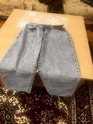 - Açıq mavi “acid wash” effektili cins şalvar: düz, geniş kəsim, 5 ciblə klassik model, ön düymə və fermuar bağlanışı, bel hissəsində dərili loqo yaması.