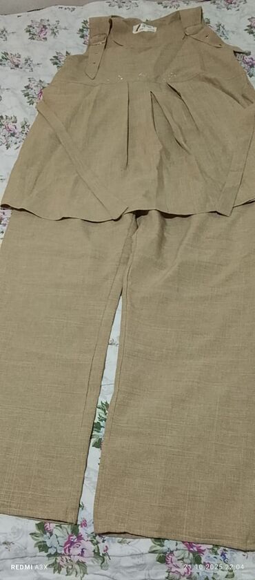 - Bej iki hissəli kostyum: Kətan tərkibli parça görünüşü. Yuxarı hissə qalın çiyin qayışlı, ön hissədə qatlanmış plise detallar və kəmərvari dekor; alt hissə düz kəsimli şalvar.