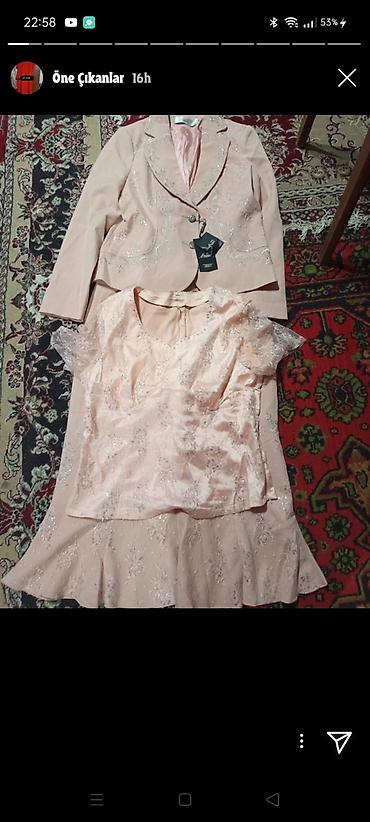 - 3 parça zərif dəst: açıq pudra rəngində jaket, qısa qollu bluz və ətək. Parçada naxış və parıltılı işləmələr var, jaketdə düyməli ön bağlama və klassik yaxa.