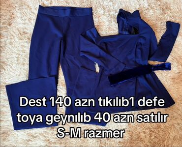 Mətn üzərində göstərilən məlumat: “Dəst 140 azn tikilib, 1 dəfə toya geyinilib, 40 azn satılır, S-M razmer.”