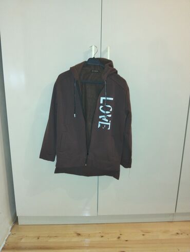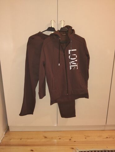 Qadınlar üçün iki hissəli sport dəst - Rəng: tünd qəhvəyi, krem rəngli detal və haşiyələrlə - Üst: kapüşonlu, oversize kəsim; qol və bədən boyunca dekorativ tikiş xətləri; alt hissədə asimmetrik, ...