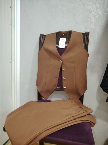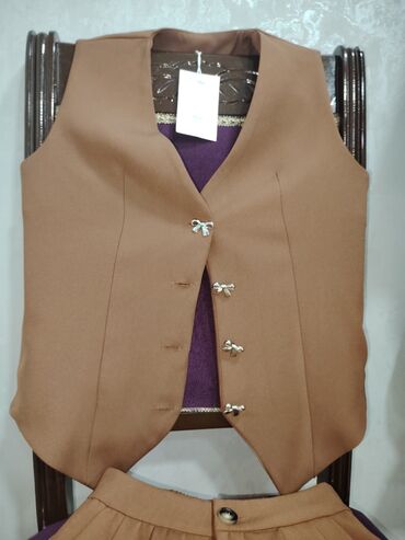 - Jilet: V-kəsim, beldə daralan kəsim, asimmetrik alt hissə, ön hissədə metal fiqurlu broş-formalı sancaq bağlamalar, astarlı görünüş