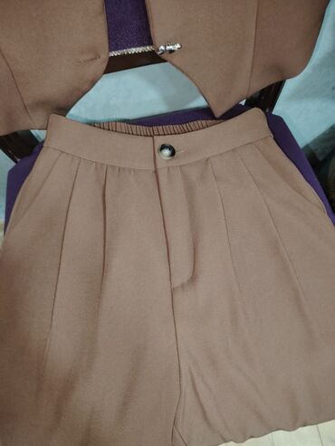 - Şalvar: yüksək belli, ön qırçınlı, yan tikiş xətti boyunca düşümlü, arxa hissədə rezinli bel, rahat kəsim, düyməli və fermuarlı bağlama