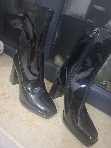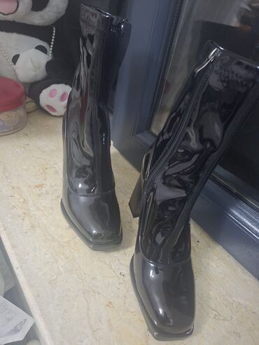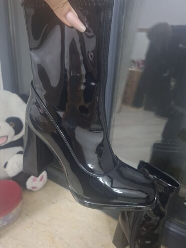 Qadın üçün zərif qara bot - Material: süet tipli parça - Burun: iti/şüarlı - Daban: nazik stilet, təxminən 8–10 sm - Bilek hissəsində parıltılı daşlı/zınqırovlu dekorativ kəmər - Rəng: tam qara, g...