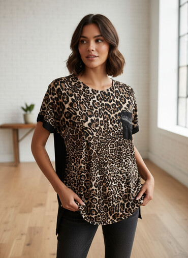 - Dizayn: Ön hissə tam leopar printli, arxa hissə əsasən qara, yuxarı hissədə leopar panellə. Ön tərəfdə qara parça cib və cibin üstündə zərif daş naxışlı bəzək xətti.