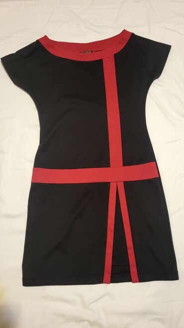 - Qara əsas parça üzərində ön hissədə qırmızı dekorativ zolaqlar: yuxarıdan şaquli xətt və beldə üfüqi kəmər effekti