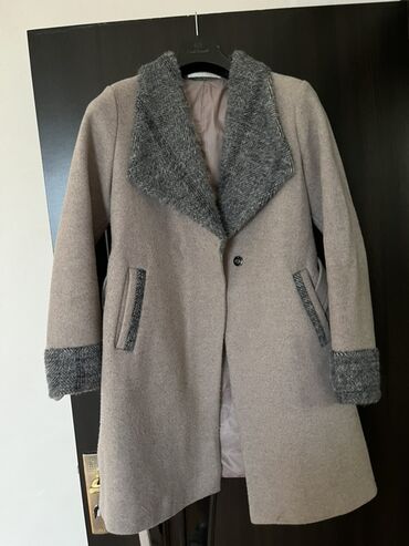 Qadın palto – bej rəng, toxuma fakturalı kumaş - Kəsim: Dizaltı uzunluq, klassik düz siluet - Yaxa: Geniş qatlana bilən şal yaxa - Bağlanma: İkiqat sırada 4 düymə - Ciblər: Ön hissədə iki iri yama...