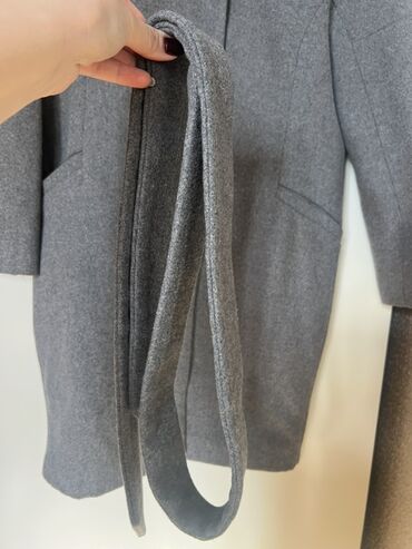 Qadın palto – boz rəngli, dizə yaxın uzunluqda - Kəsim: Klassik düz siluet, geniş çiyinlər, dərin haşiyəli (notched) yaxalıq - Bağlanma: Kəmərli – eyni materialdan kəmər beldə bərkidilir - Ciblər...