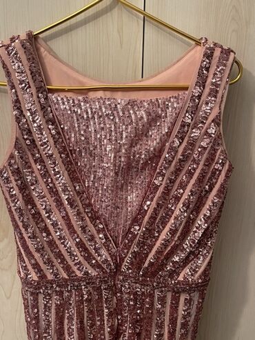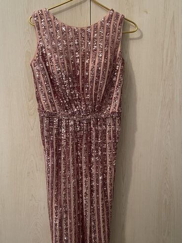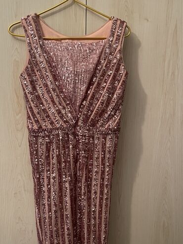 Zərif rəngi və tam payet işləməsi ilə diqqət çəkən, bədəni incə göstərən şaquli xəttli şık kombinezon. Arxa V-kəsim naxışlı panel ilə tamamlanıb.