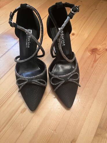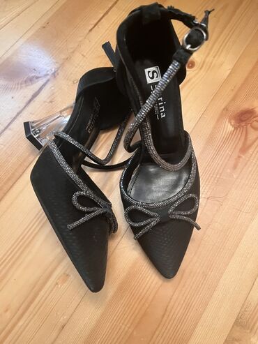 Qadın üçün elegan gecə ayaqqabısı 40 razmer - Rəng: qara (üst hissə), gümüşü detallarla - Model: sivri burunlu, açıq dabanlı, nazik daban (təxminən 8–10 sm) - Material hissi: zərif süet görünüşlü ...