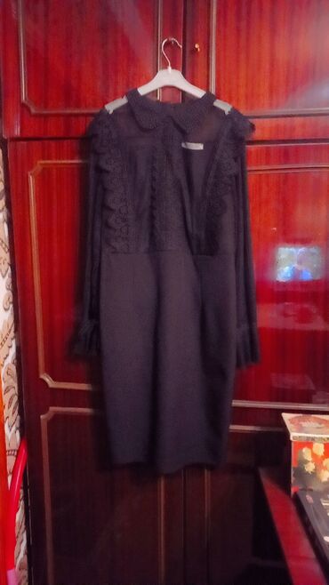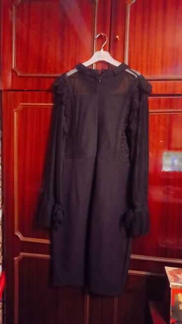 Qadın paltarı – qara, bədənə oturan midi model - Rəng: klassik qara - Dizayn: asimmetrik qatlı üst hissə, beldə nazik şəffaf (mesh) detal - Uzunluq: diz-altı/midi - Qol: uzunqol - Yaxa: qapalı/yuv...