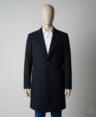Kişi üçün klassik palto - Rəng: tünd lacivərt, xırda melanj fakturalı - Material: qalın, toxumalı yun qarışığına bənzər parça (isti və zərif görünüş) - Kəsim: düz siluet, dizə yaxın uzunluq - Yaxa...