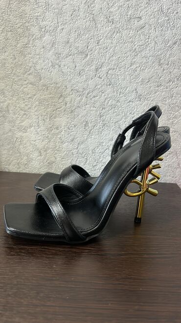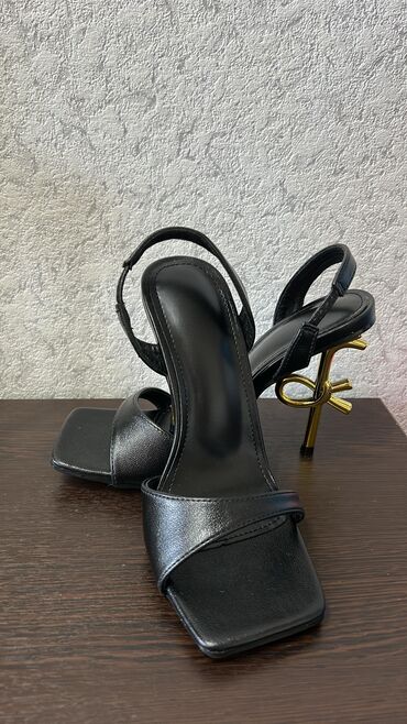 Ağ rəngli zərif dabanlı qadın sandal. - İncə ön qayış və tənzimlənən ayaq biləyi qayışı ilə rahat sabitlənmə - Qara içlik və kvadrat burun dizaynı - Qızılı metal loqo formalı dekorativ daban - ...