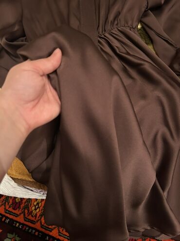 Zərif qəhvəyi rəngində atlas görünümlü uzun don. - Relaxed, oversize üst hissə, enli düşüşlü qollar - Yumşaq parıltılı, axıcı parça (satin/atlas effekti) Üst və alt ayrıdır birləşik deyil Qəhvəyi r...