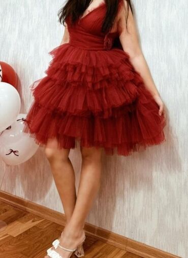 Qırmızı kokteyl/gecə paltarı 36 beden uygundur - Rəng: Parlaq qırmızı - Model: Diz üstü uzunluqda, qalın çiyin askıları, ürək formalı dekolte - Parça: Alt qat hamar parça, üst qat şəffaf tül - Det...