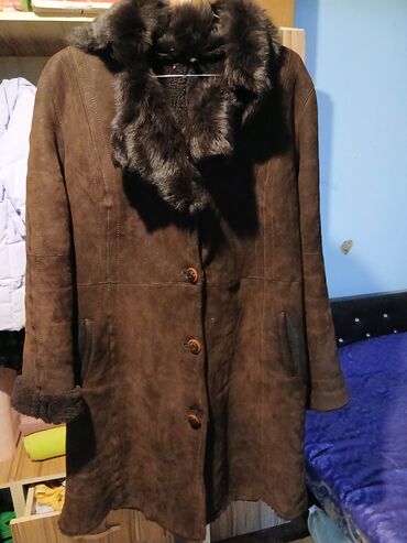 Yaxası təbi,natural xəz dərili dublyonka,Türkiyə istehsalıdır. - Model: klassik düyməli uzun palto - Rəng: tünd qəhvəyi/qaraya çalan - Material: qalın süet tipli üst material (şerling üslubu), iç...