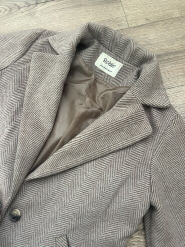 Qadın palto – İZONI, ölçü M - Rəng: açıq bej/şampan tonu - Material: yumşaq toxumalı parça, incə “balıqquyruğu” (herringbone) naxışlı - Model: oversize kəsim, dizdən aşağı uzunluq - Yaxa: enlənmiş...