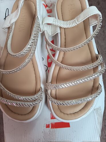 Məhsul: Qadın platforma sandaleti - Rəng: Ağ (ivory tonlarında) - Model: Açıq burunlu, qalın blok dabanlı platforma - Üst hissə: İşıltılı tül kros şeritlə bəzədilmiş - Aksent: Üzərində iri, parlaq...