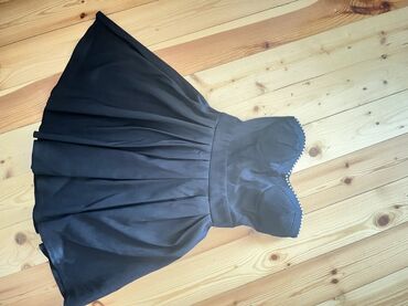Qara kokteyl/gecə donu - Brend: VIVI COLE (etiketdə “VIVI COLE”) - Ölçü: 38 - Dizayn: Tam boy boyunca qat-qat (tiered) atlas-parıltılı parçadan; strapless üst (nazik bağlama ipləri var), bədənə ot...