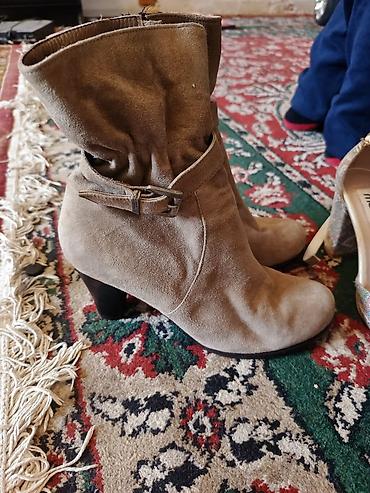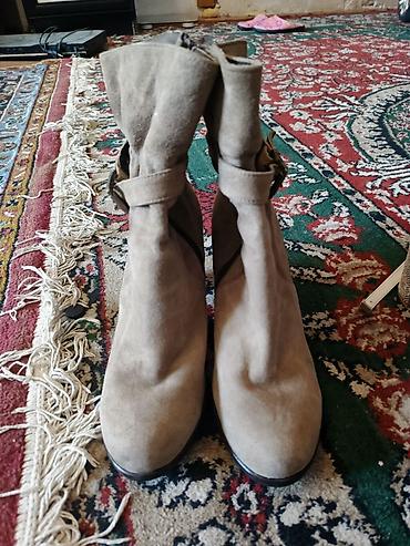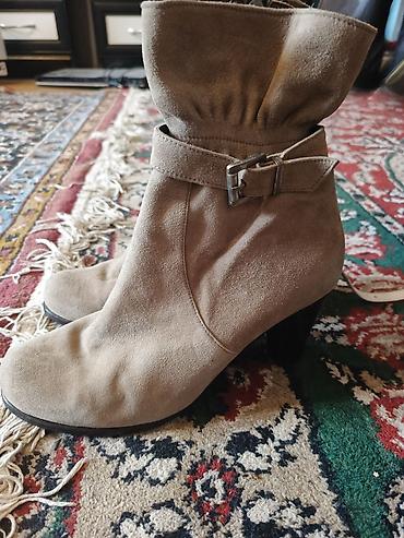 Qadın üçün süet qısa çəkmələr - Rəng: açıq bej/çəhrayı-bej ton - Material: süet üstlük, iç hissə qara astarlı - Dizayn: yan tərəfdə nazik kəmər detalları və süet püsküllü düyün - Bağlanma: yan fer...