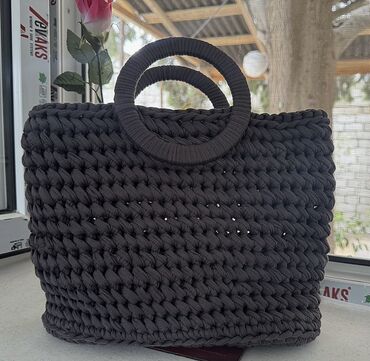 Təbii materialdan hazırlanmış əl işı toxunma çanta. - Material: toxunmuş təbii liflər (saman/rafiya tipli) - Forma: yarımdairəvi gövdə, dairəvi sərt saplar - Bağlanma: üst hissədə iplə və düyməcik...