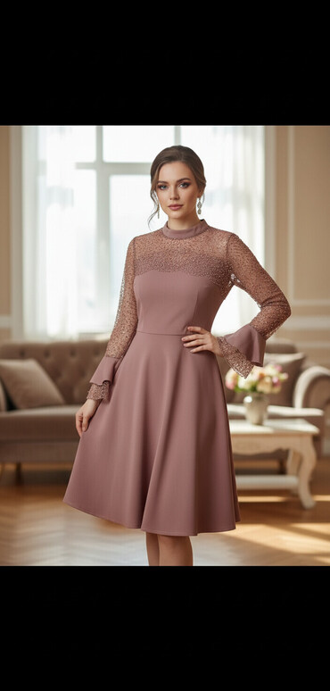 Zərif ziyafət/libas - Rəng: toz-çəhrayı (lilac tonlarında) - Model: uzun, A-kəsimli, yüngül flarlı ətək - Parça: şəffaf tül üst qat, incə romb naxışlı; altlıqla birlikdə - Yaxa: V-kəsim - Qol: 3/4...