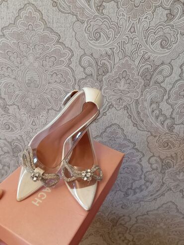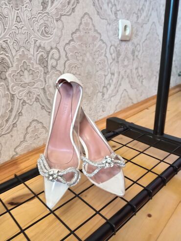 Zərif qadın tuflisi – şəffaf vinil korpusu və ağ dəri detalları ilə. İti burunlu model ön hissədə iri, parlaq daşlı metal zəncirli kəmər/bağ formasında bəzəklə diqqət çəkir. Arxa hissə açıq slingback qayışı ilə rahat oturuş verir. İçlik yumşaq, çəhrayı tonalıdır. Geyimlə kombin: gəlinlik, ziyafət, nişan, kokteyl və xüsusi günlər üçün ideal, eyni zamanda klassik şalvar-ətək dəstləri ilə də uyğundur.