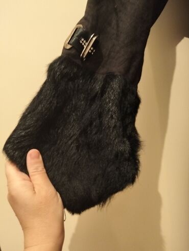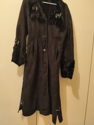 Qadınlar üçün şıq qışlıq kürk/palto - Material: qara süet tipli üstlük, iç hissəsi isti; təbii görünüşlü tük/kürk detalları - Yaxa: həcimli, qalın tüklü kürk yaxa - Dekor: ön hissədə və qollarda t...