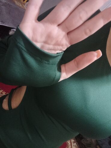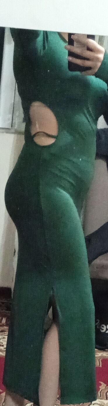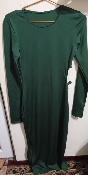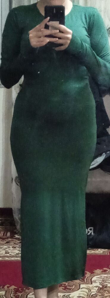 Qadın geyimi – uzun təmtəraqsız paltar - Rəng: tünd yaşıl/şüşə yaşılına yaxın - Model: dar kəsim, bədənə oturan siluet - Uzunluq: midi–uzun (baldırdan aşağı) - Yaxa: yumru - Qol: 3/4 uzunluqda - D...