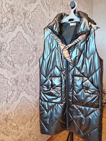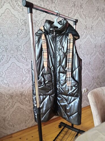 Rahat paltar yuyanda yuyulur.Defekti yoxdu.44-46 olcudur. Qadınlar üçün uzun şişme jilet - Rəng: qara, iç astarı və kapüşonun daxili hissəsi qırmızı - Dizayn: romb tikişli, kapüşonlu, ön tam uzunlu...
