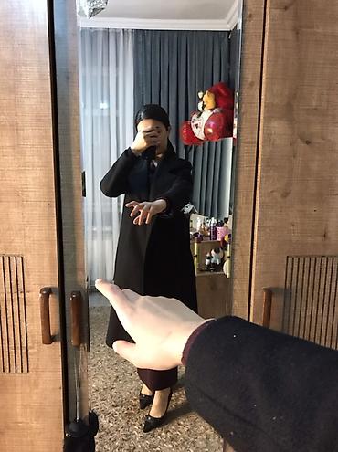 Qara rəngli eko‑dəridən qadın plaşı/yağmurluq - Brend: Kadrisher (etiketdə qeyd olunub) - Model: açıq önlü, geniş düşən yaxalı - Kəmərli – beldən bağlamaq üçün eyni materialdan kəmər - İki ədəd iri...