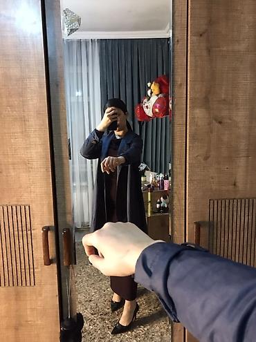 Plaş tezedi 48 razmer - Rəng: tünd göy, kontrast açıq bej detal və kəmər - Model: geniş V formalı üst yaxalıq, düyməli ön hissə - Kəmər: çıxarılan, eyni bej rəngdə - Uzunluq: orta (dizə yaxın) - Q...