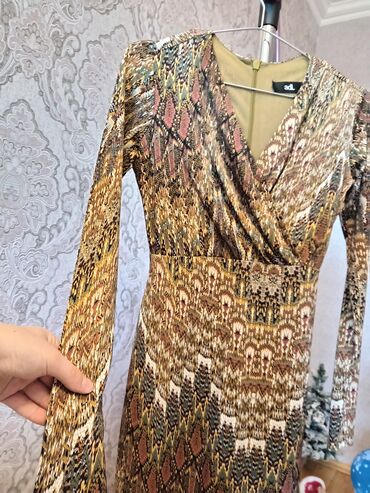 Qadın paltarı – qısaqoll, qələm kəsimli - Rəng və naxış: Tünd əsas üzərində qızılı-bürünc tonlarda romb/geometrik naxış. - Dizayn: V-yaxa, ön hissədə dekorativ fermuar detallı. - Uzunluq: Dizdən a...