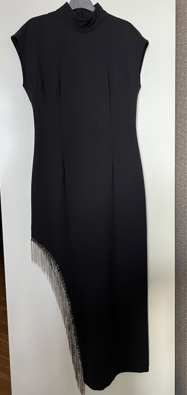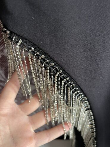 - Bəzək: Asimmetrik kəsik boyunca gümüşü rəngdə sallantılı zəncir və kristal effektli frinç detalları.