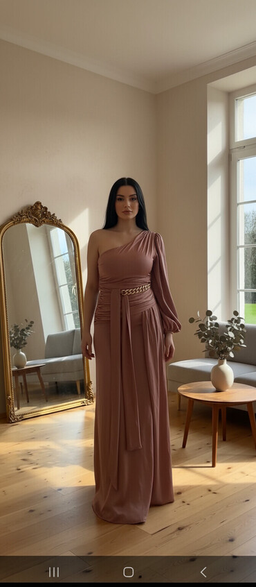1 dede geyinilib çox gözel dondur Pudra-çəhrayı rəngli, uzun və zərif ziyafət/libas. - Model: A-kəsim ətək, beldə qalın kəmər detallı, yüngül və axıcı parça - Üst hissə: Şəffaf tül üzərində 3D çiç...