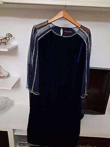 4) Tünd göy məxmər paltar: dizə qədər, çiyinlərdə və qollarda şəffaf tül örtü, kənarlarında zəncirvari daş bəzəklər, arxada düyməli açılış.