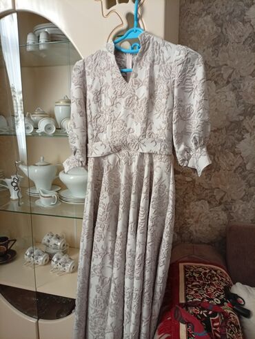 Iki ədəd qadın paltarı 1) Ağ-qara maxi paltar - Yuxarı hissə: ağ, boğazı büzgülü stend yaxalı, qısa qol. - Qolların ucları: qara krujeva detallı. - Aşağı hissə: tünd fon üzərində iri açıq rəngli b...