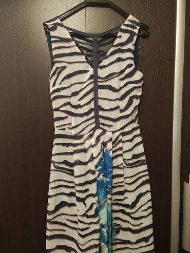 - Rəng və naxış: Açıq krem fon üzərində tünd göy və bej zolaqlar; ətəyin alt hissəsində mavi tonlarda böyük çiçək printləri.
