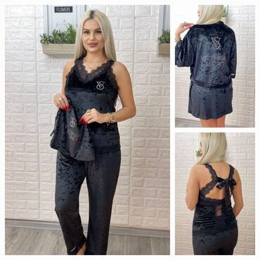 - Qısa xalat (qarayaylıq kəmərli, qol və ətəkdə kontrast haşiyə, arxada “Victoria’s Secret” yazısı və loqo)