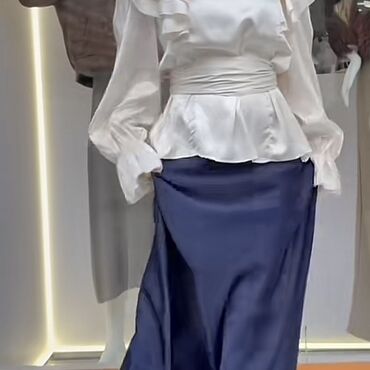 Stil: Zərif, qadınsı və klassik; ofis, tədbir və dəvətlər üçün uyğundur. Rəng kombinasiyası – ağ üst + lacivərd ətək. Parça toxuması sayəsində yüngül parlaqlıq və zərif düşüş təmin edir.
