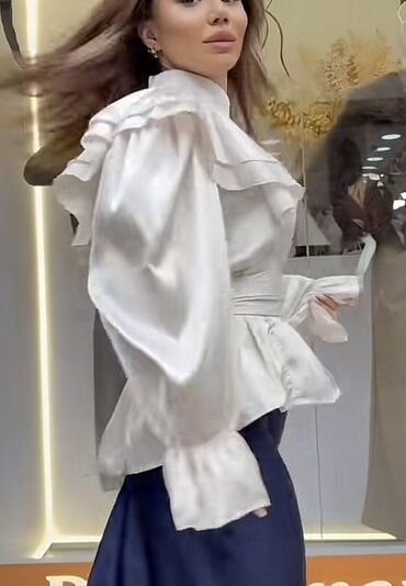 Ağ rəngli iki parçalı dəst. Özel tikilişdi. - Üst: V-yaxa, ön hissədə üç ədəd lent-bağlama detallı bluz. Uzun qol, rahat kəsim, düz ətək xətti. - Şalvar: Yüksək bel görünüşü, düz və geniş balaq, r...