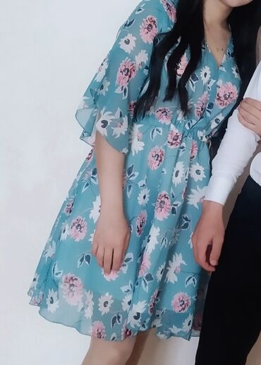 ŞifonMavi-yaşıl tonlarda çiçək naxışlı qadın paltarı.