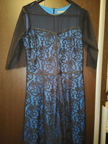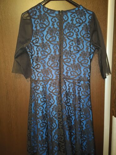 Brend: Granat Bədən ölçüsü: 40 Model: Zərif ziyafət donu Rəng: Parlaq royal-mavi Detallar: - Yarımqol dizaynı; sağ qolda güllü krujeva əlavəsi - Boyun hissəsində iri daşlarla işlənmiş bəzək - Sol...