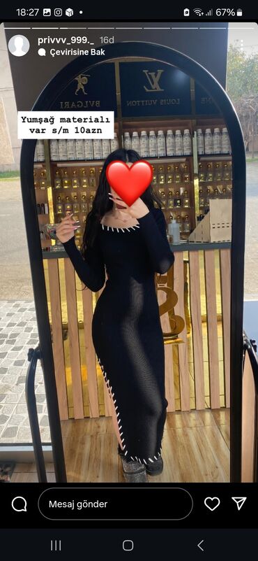 - Qara trikotaj uzun don: yumşaq material, bədənə oturan siluet, dördbucaq dekolte ətrafı ağ tikiş bəzəyi, yan boyunca və ətəkdə kontrast “sap-sap” dekorlu kəsik effekti. Mövcud ölçülər S/M, qiymət 10 AZN (şəkildə qeyd olunub).