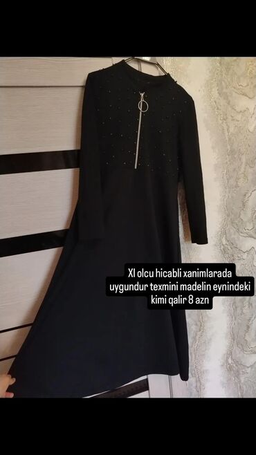 - Qara tuniк/penye don: ön hissəsi xırda muncuq/daşı bəzəkli, yuxarıdan aşağı uzanan halqalı fermuar detayı, 3/4 qol. XL ölçü, hicablı xanımlara da uyğundur. Üst yazıya görə təxminən modeldəki kimi oturur, 8 AZN.