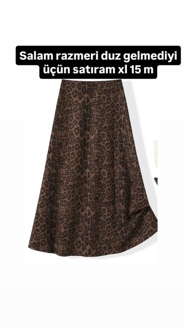 - Leopard naxışlı ətək: qəhvəyi tonlarda, A-kəsim/uzun, elastik bel ehtimalı. Yazıda: ölçü XL, 15 m, razmeri düz gəlmədiyi üçün satılır.