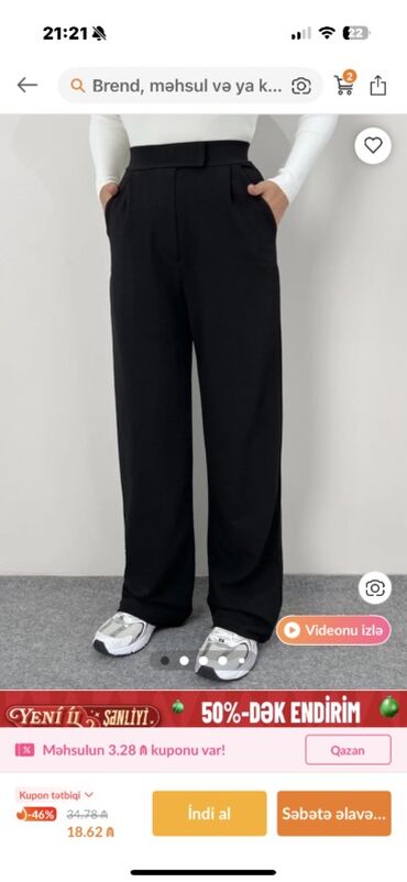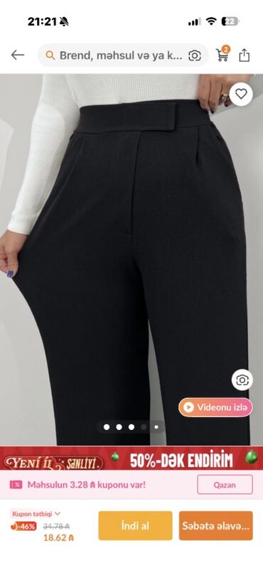 ZARA qadın şalvarı tam yeni s razmer 50m alinib hədiyyədir klassik geyinmirəm deyə satılır - Rəng: qara - Kəsim: düz/klassik, beldə yüngül pli ilə - Bağlanma: ön tərəfdə gizli düymə və fermuar - Ci...